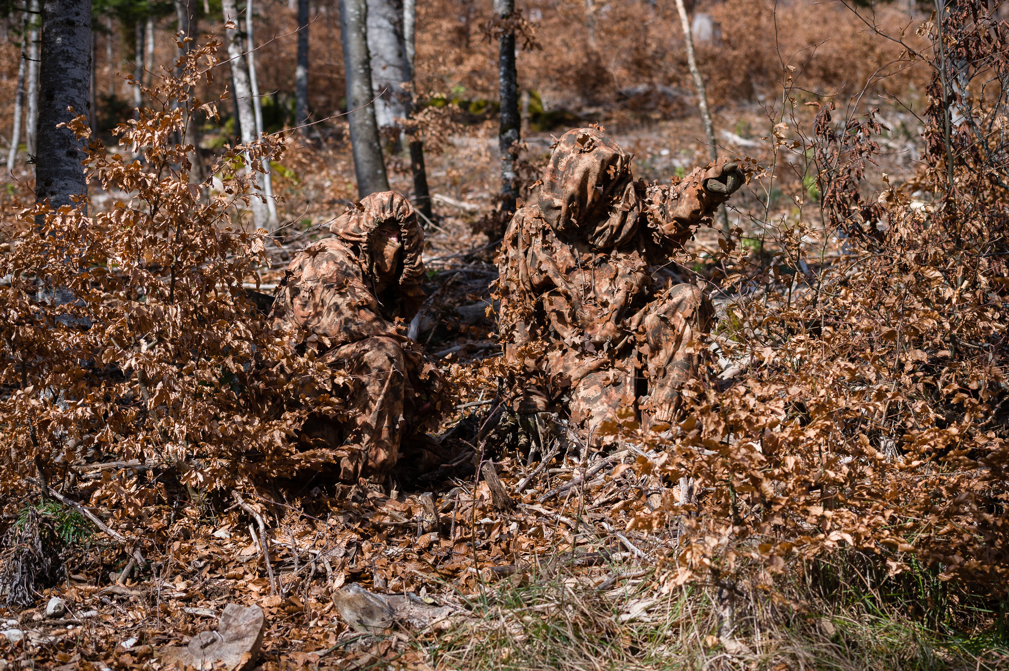 This outfit offers the operator the possibility to blend into different types of environments thanks to its reversibility, offering mutliple combinations to blend in with nature.