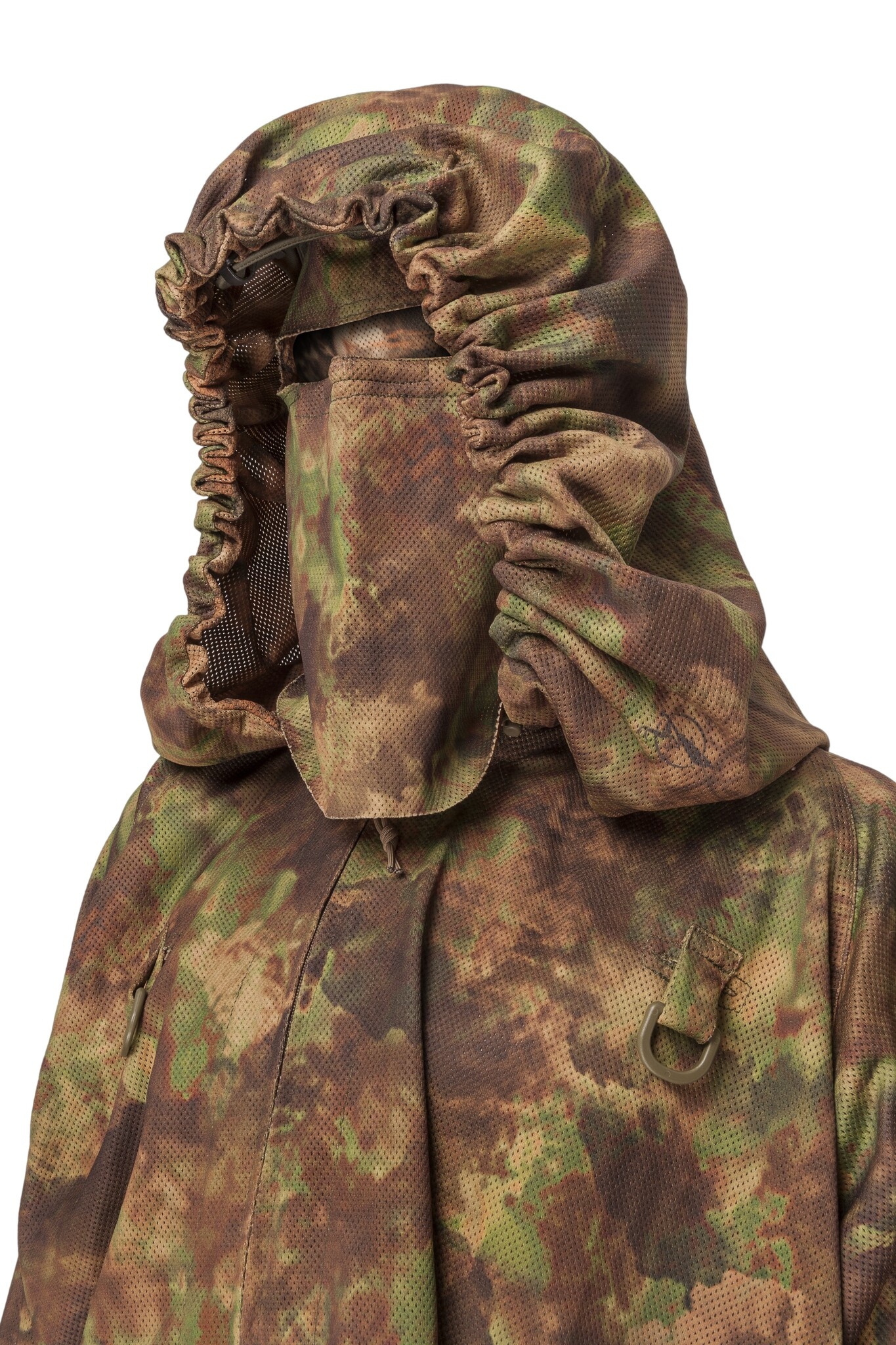 Made from a lightweight mesh, enabling you to add crafting materials if you wish to create more depth and blend further into your gameplay environment. The oversized hood which aids with the disruption of the human shape, also features clips to allow the user to attach to a baseball cap (cap not included)